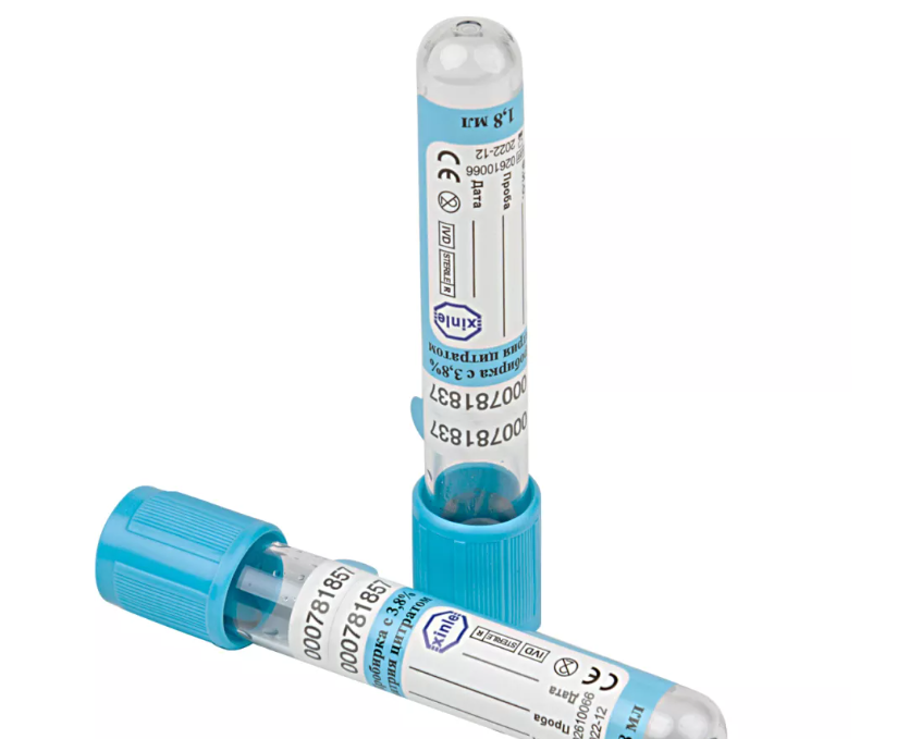 Тип пробирки: Вакуумная VacPlus Цвет крышки: голубая Наполнитель (добавка): 3,8% натрия цитрат Размер: 13 мм х 75 мм, 13 мм х 100 мм, 16 мм х 100 мм Объем забираемой крови: 9 мл, 1,8 мл, 2,7 мл, 3,6 мл, 4,5 мл, 5,4 мл, 6,3 мл, 7,2 мл, 8,1 мл Упаковка: 100 шт.